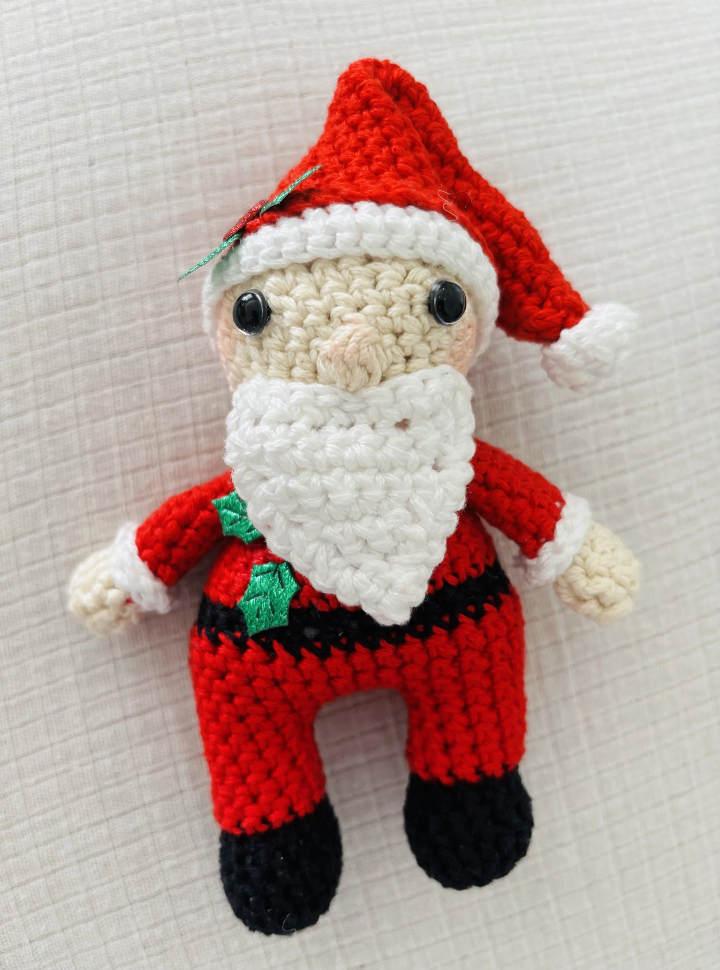 Sweet Santa doll adorned with holly sprigs, approximately 5”